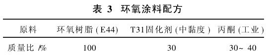 喷砂除锈检查合格后进行喷铝,要求喷铝层均匀,附着力好。钟罩内部喷铝工艺条件为:空气压力0. 5~0. 6MPa;乙炔气压力0. 06~0. 1MPa,常用0. 07MPa;氧气压力0. 5~0. 6 MPa;铝丝直径为<2. 3~<3 mm;进丝速度1. 7~2. 2 m/min;枪口移动速度10~17 cm/s;枪口与气柜壁距离90~140mm;喷射角度为80b~90b,特殊部位45b;喷铝层厚度0. 2~0. 3 mm;喷铝层数2层;钟罩铝层上刷涂环氧涂料2层。环氧涂料配方见表3。